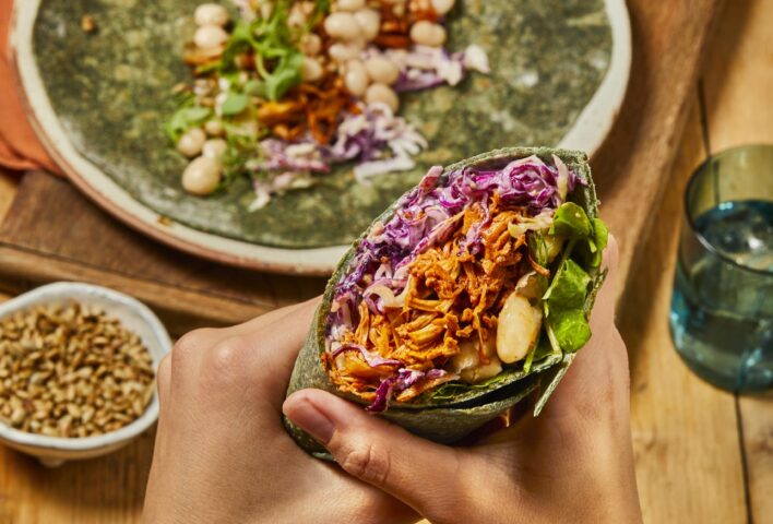 - To assemble the wraps: On a plate, place your flatbread add the beans, jackfruit, coleslaw, some watercress or cress and a sprinkle of toasted sunflower seeds. Roll up the wraps tightly to finish.