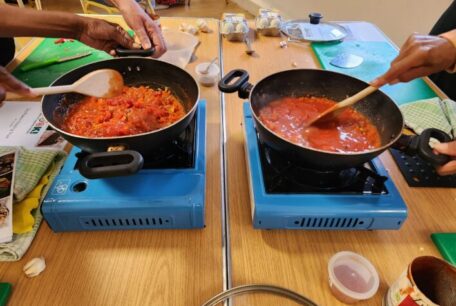 - Meanwhile, heat a saucepan on a medium heat. Add 1 tbsp vegetable oil. When the oil is hot, add the onions and a pinch of salt. Sauté for 5-7 minutes until soft and translucent. Add the curry paste and cook for 5 minutes stirring constantly. Add the coconut cream and approximately half of the liquid from the coconut milk. Stir well. Add the cherry tomatoes and cook for 10 minutes. Add the cooked plantain and cook for a further 10 minutes, stirring regularly. Add more liquid from the coconut milk can if needed. The curry should be thick but still have visible sauce. Season to taste.